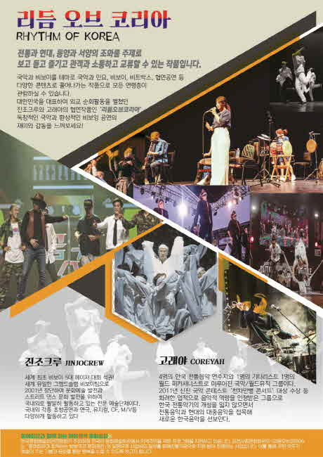 2019년 <문예회관과 함께하는 방방곡곡 문화공감>사업에서 선정된 '리듬 오브 코리아'는 비보이 예술단체 진조크루와 국악팀 고래야의 협연으로 이루어지는 복합예술 공연으로 국악과 민요, 비보이, 비트박스, 협연공연 등 다양한 콘텐츠로 전통과 현대, 동양과 서양의 조화를 주제로 관객과 소통하고 교류할 수 있는 작품이다.
