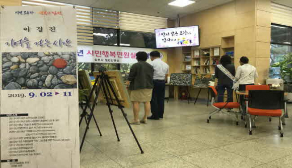 장귀희 열린민원실장은 “시민 모두의 행복을 위한 ‘Happy Together 김천’운동과 ‘시민행복민원실’ 운영에 (사)한국미술협회 김천지부(지부장 엄태진) 회원들이 적극 동참해 주셔서 많이 감사드리며, 앞으로도 시민 여러분의 소소하지만 확실한 행복과 추억을 공유하는 공간으로서의 열린민원실이 될 수 있도록 최선을 다하겠다.”고 말했다. |