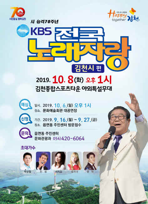 온 국민의 사랑을 받고 있는「KBS 전국노래자랑」이 시 승격 70주년을 맞이하여 10월 8일(화) 오후 1시 김천종합스포츠타운 야외특설무대에서 본선 녹화공연이 열린다.