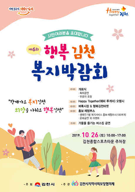 김천시(시장 김충섭) 가 주최하고 김천시지역사회보장협의체(공동위원장 배수향)가 주관하는 『제6회 행복김천 복지박람회』가 10월 26일(토) 오전 10시부터 오후 5시까지 김천종합스포츠타운 주차장에서 개최된다.