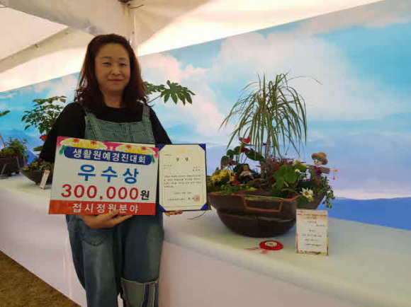 상주시농업기술센터(소장 손상돈)는 10월 16일부터 18일까지 경북도청 새마을광장에서 열린 제15회 경상북도 생활원예경진대회 접시정원분야에서 상주시우리꽃지킴이회 회원 허경미씨가 우수상을 수상했다고 밝혔다. 허씨의 수상작은 ‘가을소풍’으로, 소년 소녀가 작은 연못 주변에 소풍을 나와 즐기는 내용을 담은 작품이다. 주변에서 흔히 볼 수 있는 재료를 사용해 정겨움을 더했다. 행복한 어린 시절 추억을 떠올리게 하는 따뜻한 스토리를 표현해 주목을 받았다.