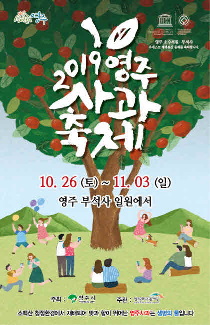 2019영주 사과축제는 부석사 주차장에서 10월 26일부터 11월 3일까지 9일간 진행하는 영주의 마지막 축제로 자세한 내용은 (재)영주문화관광재단 홈페이지 (http://www.yctf.or.kr/)에서 확인하면 된다. |