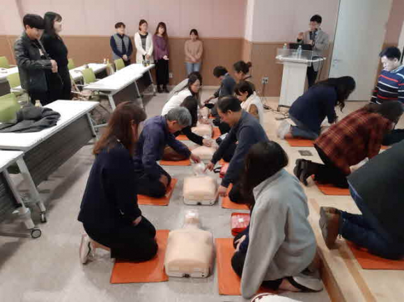 선린대학교 응급구조과 교수와 1급 응급구조사 2명이 응급상황 대처법, 심폐소생술 이론 및 실습교육, 자동심장충격기(AED) 사용법을 교육했다.