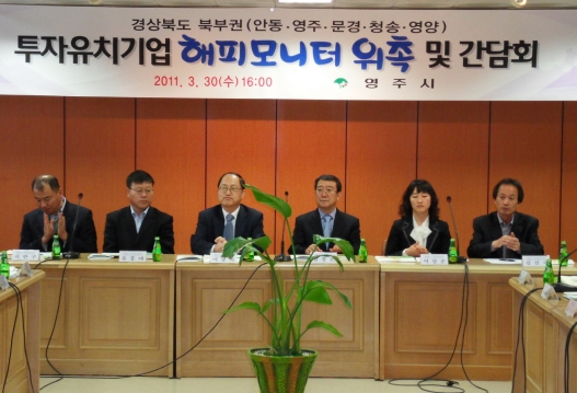 영주시(시장 김주영)에서 3.30일 경상북도 주관으로 영주시에 투자한 OCI머티리얼즈(주) 등 8개 기업을 포함해 경북북부 5개시군(안동, 영주, 문경, 청송, 영양)에 투자한 20개 투자기업 임직원을 해피모니터로 위촉해 투자기업과의 상시 커뮤니케이션 시스템구축과, 기업애로사항과 관련한 의견수렴을 위해 해피모니터로 위촉하고 이들과 간담회를 개최했다.