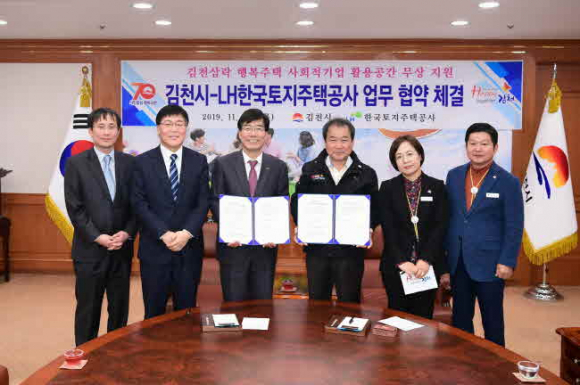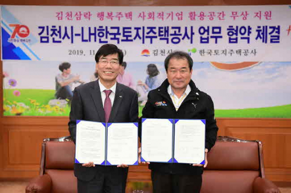 김천시(시장 김충섭)는 지난 14일 LH한국토지주택공사(이하 한국토지주택공사)와 김천삼락 행복주택 사회적기업공간 입주를 위한 협약을 체결하였다. 이날 협약식에는 김충섭 김천시장, 한국토지주택공사 대구경북지역본부 김정진 본부장 외 11명이 참석하였다. 이번 협약은 경상북도 내에는 최초로 시행되는 사업으로 한국토지주택공사에서 「공공주택 업무처리지침」에 의거 사회적기업의 공익목적기관의 자립, 조기안정화 성장을 지원하고자 장기공공 임대주택 내에 사회서비스 또는 일자리 제공이 가능한 사회적기업이 입주할 수 있도록 127㎡의 점포를 20년간 무상으로 제공하게 된다.