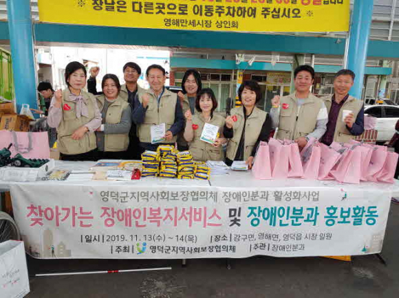 영덕군지역사회보장협의체(공공위원장 이희진, 민간위원장 박진현) 장애인분과는 11월 13일과 14일 영덕, 영해, 강구시장에서 장애인 복지서비스 안내와 장애인에 대한 인식개선 캠페인을 진행 했다. 장애인분과 위원과 장애인 기관·단체 직원들은 지역주민들에게 장애인 복지서비스를 안내하고 장애인 체험 프로그램 등을 진행하며 장애인에 대한 인식개선을 위한 활동을 벌였다.