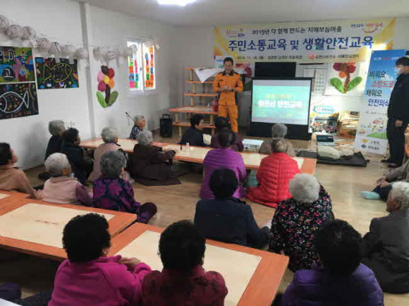 다음은 김천소방서 예방안전과 협조로 심폐소생술, 낙상사고 방지, 소화기 사용법 등 실생활에서 필요한 안전교육을 실시하여 어르신들에게 발생할 수 있는 안전사고를 미연에 방지하고 자립· 자활적 생활에 도움을 주었다.