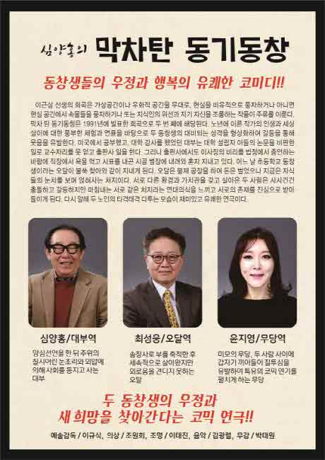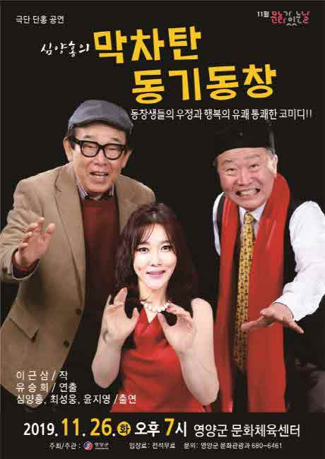 영양군(군수 오도창)은 11월 26일(화) 오후 7시 영양군 문화체육센터에서 11월 문화가 있는 날을 맞아 『심양홍의 막차탄 동기동창』연극 공연을 개최한다. 연극 “막차탄 동기동창”은 극단 단홍의 32주년 기념 공연으로 고(故) 이근삼 선생의 작품이다. <드링커>, <뺑끼통>, <신의 아들> 등을 연출한 유승희 연출로 연극과 영화, TV 등에서 활발한 활동을 하고 있는 심양홍, 최성웅, 윤지영이 출연하여 고품격 연기력으로 특유의 코믹 연기를 선보인다.