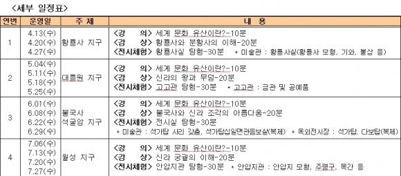 시청각 자료를 활용해서 세계문화유산에 대해서 배우고, 전시실 감상 및 학습이 이루어질 예정이다. 월별 주제를 달리하여 황룡사 지구, 대릉원 지구, 불국사·석굴암 지구, 월성지구를 차례로 살펴볼 예정이다(세부일정 참고).