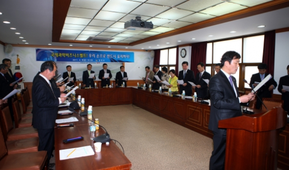 긴급대책회의 자리에는 최양식 경주시장, 김일헌 경주시의회 의장 등 경주지역 기관단체장 20여명이 참석해 회의를 개최, 최근 보도된 삼각벨트 형태의 국제과학비즈니스벨트 추진 반대에 대한 공동 성명서를 발표했다.
