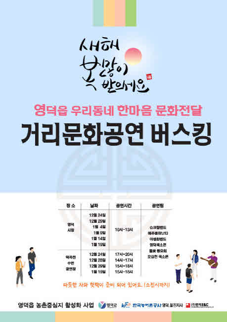영덕군농업기술센터는 영덕읍 농촌중심지활성화사업의 일환으로 영덕시장과 덕곡천 주변에서 거리문화공연 버스킹을 영덕장날(4일, 9일)에 맞춰 1월 19일까지 개최한다.