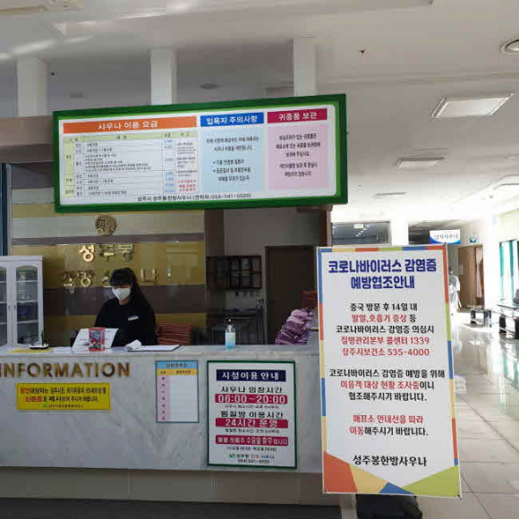 코로나바이러스 확진자가 늘어나면서 시민들의 불안감이 고조됨에 따라 한방사우나에서는 3일부터 이용객들을 대상으로 발열 여부와 연락처를 확인하고 있다. 이를 위해 창구 앞에 손님 대기선도 설치했다. 이곳을 이용한 사람 중 확진자가 나올 경우 추적을 위한 조치다.