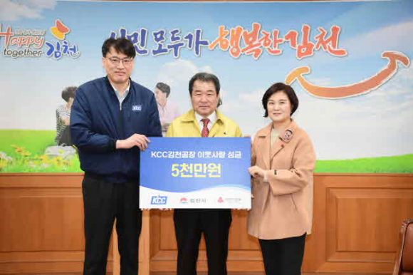 KCC김천공장(공장장 서금덕)은 지난 14일(금) 김천시청을 방문하여 이웃돕기성금 5천만원을 기탁했다. KCC김천공장 서금덕 공장장은 “우리 KCC는 기업으로서 사회적 책임을 다하기 위해 다양한 사회공헌 활동을 하고 있다. 우리 임직원들의 마음이 추운 겨울을 나는 어려운 이웃들에게 잘 전달되길 바라며 성금을 전하게 되었다. 지속적인 나눔으로 김천시민과 함께 성장하는 기업이 되도록 노력하겠다.”고 밝혔다.