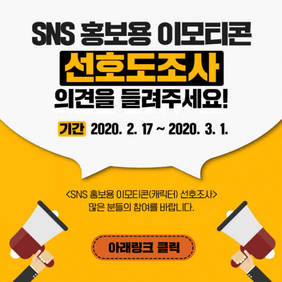 서동주 공보감사담당관은“사람들에게 친근하게 다가갈 수 있는 SNS 홍보용 이모티콘(캐릭터)이 선정될 수 있도록 선호도 조사에 많은 관심과 적극적인 참여를 부탁한다”고 말했다.