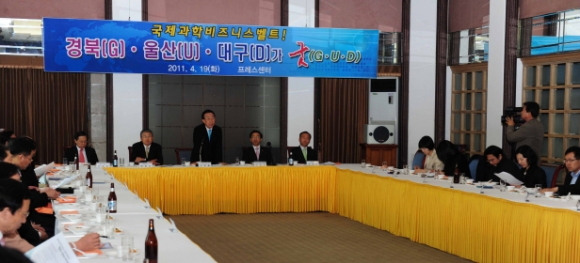 경주시(최양식 시장)는 4. 19(화) 서울 프레스센터에서 국제과학비즈니스벨트 경북(G)·울산(U)·대구(D) 3개시도 지역유치의 당위성 홍보를 위해 교육과학기술부 출입기자 간담회에 참석했다.