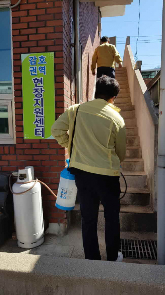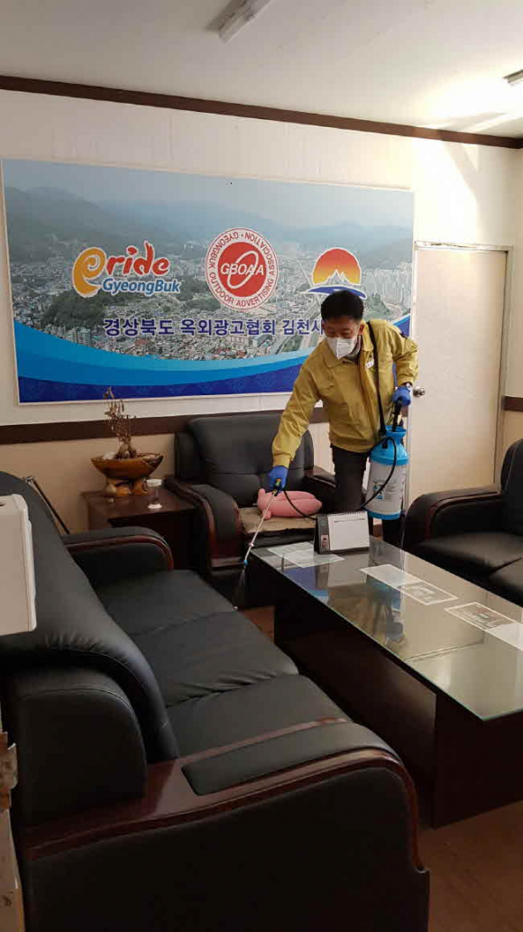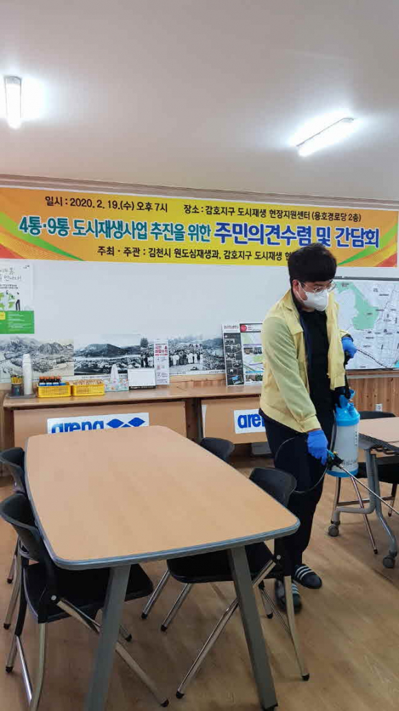 김천시 원도심재생과에서는 11일 “일제 방역소독의 날”을 맞아 코로나19 확산방지를 위해 주민과의 대민 접촉이 많은 도시재생지원(현장)센터 등에 대한 자체 방역소독에 나섰다. 이날 원도심재생과에서는 공무원이 직접 방역팀을 꾸려 평화동 도시재생지원센터, 감호동 현장지원센터, 경북옥외광고협회 김천시지부 및 과 사무실에 대한 일제 방역소독을 실시하였다.
