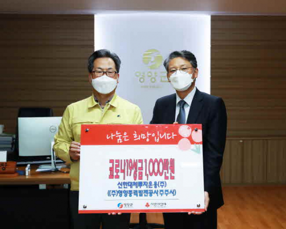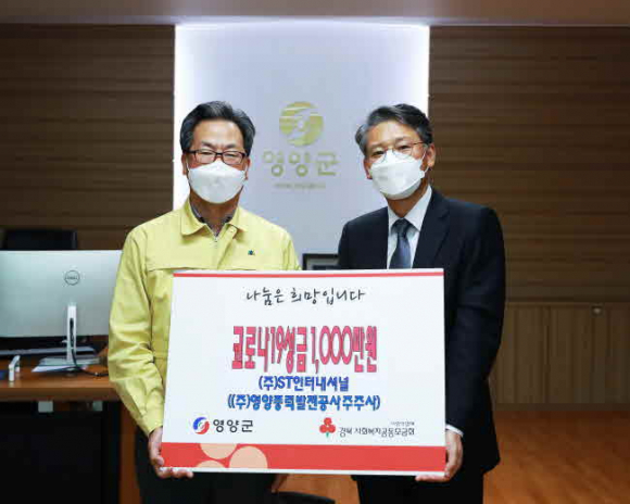 ㈜영양풍력발전공사(대표 권성민)에서는 지난 3월 23일 영양군청을 방문하여 주주사인 ㈜ST인터내셔널과 신한대체투자운용㈜가 주축이 되어 각각 1,000만원씩 총 2,000만원의 성금을 전달하며 코로나19 극복에 동참했다. 전달식에 참석한 ㈜영양풍력발전공사 권성민 대표이사는 “코로나19 확산 방지를 위한 범사회적 총력 대응 노력의 일환으로 주주사의 결정에 따라 다시 한 번 기탁에 동참하게 됐다. 앞으로도 지역사회의 어려움을 함께 하고 도움을 드릴 수 있도록 노력하겠다”고 소감을 밝혔다. 풍력공사는 지난 3월 2일에도 1천만원 상당의 손소독제 1,500개를 기탁한 바 있다.