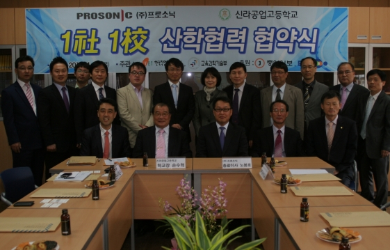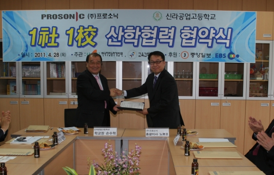 (주)프로소닉 노봉호 총괄이사, 직업능력개발원 권대봉 원장, 교육과학기술부 김환식 과장, 경상북도교육청 서한영 장학관 그리고 신라공업고등학교 손수혁 학교장과 관계자 다수가 참석한 가운데 산업현장에 적합한 우수 기술 인력 양성을 위한 1교(校)1사(社) 산∙학 협력 협약식을 가졌다.