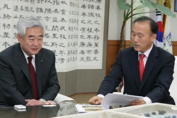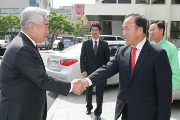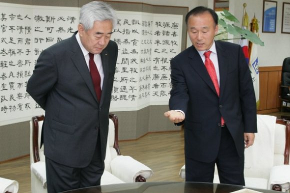 사진설명) 4월 28일 2011경주WTF세계태권도선수권대회 개회를 앞두고, 조정원 세계태권도연맹 총재가 경주를 방문, 경주시청에서 최양식 경주시장의 환대를 받고 있다.