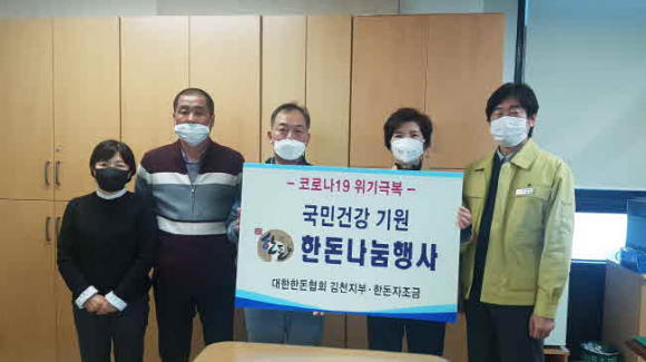 지난 27일 김천신협(이사장 박원효)은 김천시를 방문해 마스크 10,000장을 전달했다. 전달된 마스크는 기탁자의 뜻에 따라 코로나 19로 힘든 시기의 최전선에서 함께하고 있는 방역봉사자와 의료진에게 전달되었다. 뿐만 아니라, 30일에는 (사)대한한돈협회 김천지부(지부장 김이동)에서 돼지고기 846kg을 전달하여, 코호트격리로 힘든 시기를 보냈던 사회복지생활시설에 큰 힘을 보탰다. 김천시 관계자는 “모두가 힘든 때, 쉼 없이 나눔을 이어주시는 시민·기관·단체 여러분에게 깊은 감사의 인사를 드린다. 우리 직원들도 십시일반 뜻을 모아 나눔에 동참하게 되어 기쁘다. 조금만 더 힘을 내서 이 힘든 시기를 슬기롭게 잘 이겨내자.”고 말했다. 지난 달 말, 김천시 직원들은 자발적인 참여로 성금 4,232만원을 모금하였다. 성금은 경북사회복지공동모금를 통해 코로나19로 어려움을 겪고 있는 관내 저소득층 및 사회복지시설에 다양한 사업으로 지원될 예정이다.
