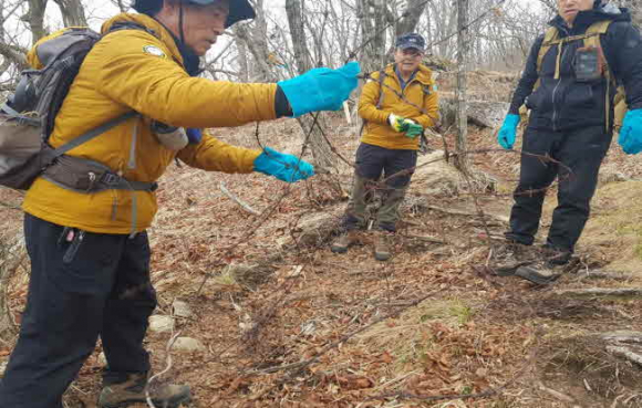 이번 작업에는 불법엽구 수거는 물론 특히 수도산반달가슴곰지킴이에서는 수도산 9부 능선에 설치된 길이가 1,500미터에 이르는 3단으로 된 철망 제거작업을 실시하여 철망 500㎏정도를 절단∙수거하고 산 쓰레기(100㎏)도 함께 수거하였다.
