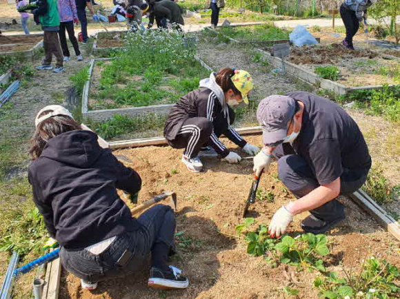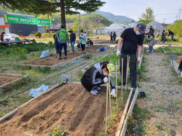 김천시 새마을회(회장 임영식)에서는 지난 4월 25일 황악예술체험촌(김천시 봉산면 소재)에서 새마을 공동체 정원사업 ‘가족텃밭 정원학교’를 개강했다. 새마을 공동체 정원사업 정원학교는 유휴지를 활용하여 이웃과 함께 텃밭을 가꾸면서 공동체 의식을 함양하는 사업으로, 2015년 행정안전부 공동체 정원사업 공모사업에 선정되어 확보한 사업비 1억 5천만원으로 정원사업 기반시설을 조성하였다. 2016년부터 매년 30가구를 대상으로 텃밭을 분양하고, 매월 셋째주 토요일마다 천연염색, 요리교실 등 다양한 프로그램도 병행해서 운영해 오고 있다. 이날 공동체 정원학교 개강식은 코로나19 사회적 거리두기를 준수하며 특별한 의식행사 없이 간단한 사업 소개를 마친 뒤 텃밭 추첨, 모종 식재, 손소독제 만들기 순으로 진행하였다. 텃밭을 분양받은 가족들은 읍면동 새마을회장들의 도움을 받아 이랑 만들기, 멀칭 작업(경지토양의 표면 덮기)을 진행하였고 새마을회에서 준비한 모종(대추방울토마토, 비트, 오이, 가지 등)과 각자 준비해온 모종을 심는 등 텃밭 조성에 정성을 쏟았다.