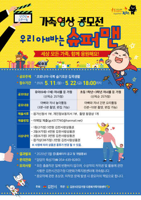 김천시건강가정․다문화가족지원센터(센터장 이민정)은 가정의 달을 맞이하여“우리 아빠는 슈퍼맨”가족 영상 공모전을 개최한다.