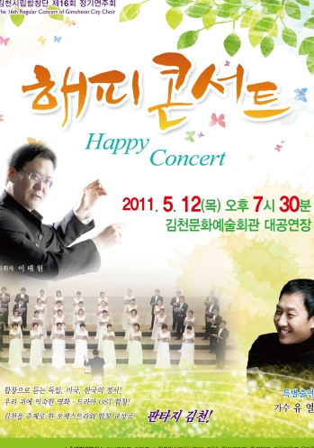 ▶김천시립예술단정기연주회=김천시립합창단 제16회 정기연주회 ‘해피콘서트’가 5월12일(목) 오후7시30분 문화예술회관 대공연장에서 ‘가수 유열’의 특별무대와 함께 준비되어 있다.