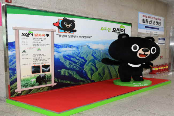 김천시는(시장 김충섭) 시청로비에 자체 SNS 홍보캐릭터 오삼이 포토존을 설치했다. 수도산 배경에 오삼이 조형물을 배치했고, 캐릭터의 실제 모델인 반달가슴곰 KM-53이 김천으로 삶의 터전을 옮기게 된 과정을 요약하여 한눈에 볼 수 있도록 했다. 이번 포토존은 귀여운 이미지의 김천시 캐릭터를 활용, 시민들이 친근감을 갖고 오삼이를 자연스럽게 인지할 수 있는 홍보방법의 일환으로 제작되어, 김천 공식 SNS, 현수막, 각종 시정 리플렛 등에서 이미지로만 볼 수 있었던 오삼이를 더욱 가까이에서 만날 수 있게 되었다. 모험왕, 콜럼버스 곰 등으로 불리며 일찌감치 언론의 주목을 받은 반달가슴곰 KM-53은, 총 3번의 탈출 끝에 수도산에 자리잡게 된 실제 스토리텔링을 모티브로 지난해 말 김천시 SNS 홍보캐릭터로 탄생했다.
