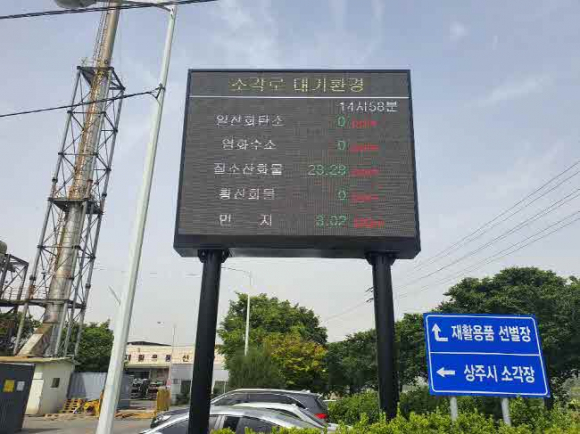 상주시(시장 강영석)는 15일 대기오염 전광판을 설치해 상주시 소각장에서 발생하는 대기의 오염도를 시민들에게 실시간으로 제공하고 있다.