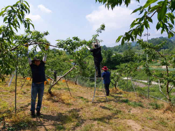 지난 5월 29일 김천시문화예술회관(관장 김홍연)에서는 본격적인 농번기를 맞아 일손부족으로 어려움을 겪고 있는 증산면 부항리 과수 농가를 방문하여 농촌 일손돕기를 추진했다.