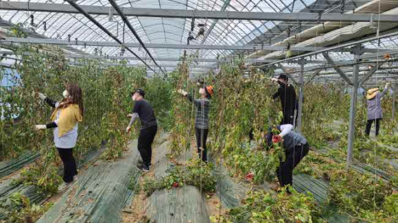 농번기와 코로나19 장기화로 일손 부족을 겪고 있는 농가를 돕기 위한 봉사활동으로 이날 12명의 직원들은 토마토 줄기제거 작업을 진행했다.