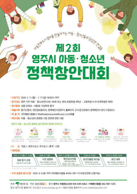경북 영주시(시장 장욱현)는 아동청소년의 목소리를 듣고 시정에 반영하기 위한 「제2회 영주시 아동청소년 정책창안대회」 참가자를 7월 17일까지 모집한다.