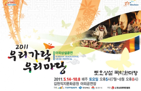김천시는 직지문화공원을 문화향유의 휴식공간으로 제공하기 위해 5월부터 10월 까지 매주 토요일 저녁 야외 공연장에서 사랑하는 가족과 연인, 이웃등과 다함께 즐길 수 있는 2011「우리가락 우리마당」토요 상설공연이 5월 14(토요일) 힘찬 팡파르를 울리며 개막된다고 밝혔다.