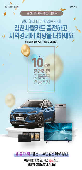 김천사랑카드 운영대행사인 코나카드 주식회사는 6월 한달동안 김천사랑카드 충전이벤트 행사를 실시한다. 6월 30일까지 ‘그리고(지역화폐)’ 김천사랑페이 앱에서 김천사랑카드 10만원을 충전할 때마다 자동 응모되며 7월 1일 유튜브를 통해 경품 추첨이 진행된다. 경품으로는 1등 코나 하이브리드(1명), 2등 삼성전자 TV(1명), 3등 삼성전자 식기세척기(2명), 4등 견과류세트(50명), 6등 김천사랑카드 5천원 할인쿠폰(140명)이다. 김천사랑카드는 만 14세 이상이면 주소지와 상관없이 누구나 신청할 수 있으며 김천사랑페이 스마트폰앱을 이용하여 금융기관 방문 없이도 발급·충전이 가능하다.
