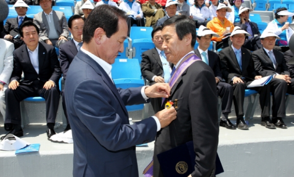 15일 포항종합운동장에서 열린 ‘한국자유총연맹 2011 전국한마음대회’에서 포항시 김순태 자치행정국장(오른쪽)이 국제과학비즈니스벨트 유치 활동 중인 박승호 포항시장을 대신해 박창달 한국자유총연맹회장(왼쪽)으로부터 야오잉치 세계자유민주연맹회장이 주는 자유장을 수상했다. |