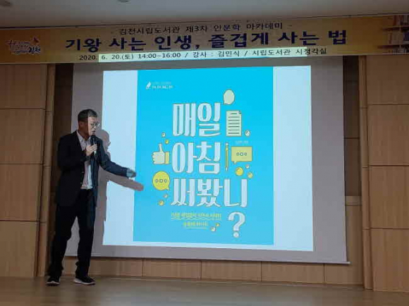 김천시립도서관(관장 김금숙)에서는 지난 20일, MBC 드라마 연출을 맡고 있는 김민식 PD를 초청하여 제3차 인문학 아카데미 강연을 진행했다. 베스트셀러 작가이기도 한 김민식 PD는 「기왕 사는 인생, 즐겁게 사는 법」이라는 주제로 자신의 인생사를 즐겁게 이야기로 풀어내어 참가자들에게 유쾌하고 행복한 시간을 선사하였다. 삶의 고난을 겪을 때마다 도서관을 찾아 200여권의 책을 읽으며 해답을 찾은 자신만의 경험을 통해 성공담을 전하였으며, 도서관 활용법과 그 효과에 대한 예찬을 아끼지 않았다. 또한 행복이란 직장, 가정, 사회에서 내가 즐길 수 있는 것들을 찾아 실행하며, 그 소소한 행복들이 모여 일상의 즐거움을 만들어 낸다는 점을 강조하였다. 강연 말미에는 즉문 즉답형식의 색다른 강연 진행으로 시민들과 서로 호흡하며 김민식 PD만의 재치 있는 입담으로 현장분위기를 고조시켜 참가자들에게 큰 호응을 받기도 했다.