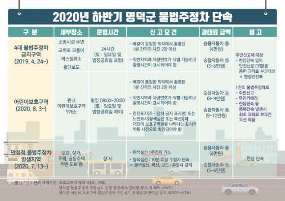 한편, 현재 영덕군은 관내 불법 주정차 무인 단속 카메라 3개소와 이동형 단속차량 1대를 운영하고 있다. 불법 주정차 과태료는 승용차 4만원, 승합차 5만원이며, 어린이 보호구역 위반 차량의 경우 2배의 금액을 부과한다.