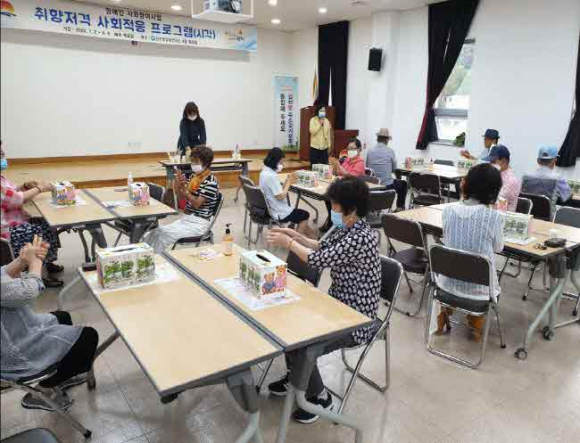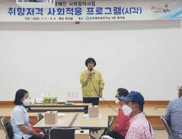 김천시보건소는 7월 2일부터 8월 6일까지 매주 목요일 중앙보건지소 4층 회의실에서 지역사회 시각장애인의 취미활동 공예 프로그램을 운영한다. 이번 프로그램은 시각 결손으로 인해 사회활동에 제한이 있는 시각장애인들에게 공예 프로그램을 제공하여 자존감 향상 및 우울감을 해소와 삶의 만족도를 제고하기 위한 목적으로 운영된다. 매주 목요일 6주 과정으로 진행되는 공예 프로그램은 휴지케이스, 수경화분, 천연비누, 다육이 화분, 모기퇴치스프레이, 냄비받침 만들기 등 다양한 만들기 활동으로 구성되어 있는데, 이러한 공예 활동의 감각자극을 통해 정서적 안정과 사회적 활동에 적응할 수 있는 능력을 향상 시킬 계획이다. 코로나 19 확산방지를 위해 출입 전 대상자들의 체온측정과 손 소독, 마스크착용을 실시하여 안전하게 프로그램에 참여할 수 있도록 최선의 노력을 할 것이다.