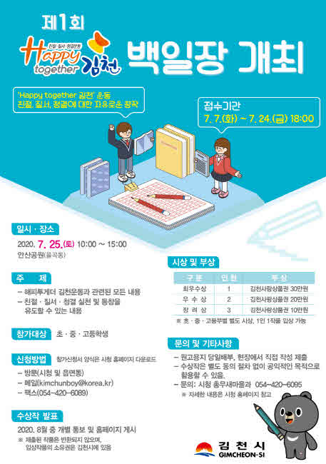 김천시는「Happy together 김천」운동의 범시민 실천 동참과 학생들의 참여를 위해 초·중·고등학생을 대상으로 제1회 해피투게더 김천 백일장을 개최할 예정이다.