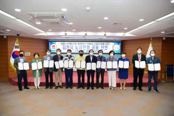 김천시 노사민정협의회(위원장 김충섭 김천시장)는 7일(화) 2020년 정례회를 개최하여 코로나19로 인한 지역 경제위기 극복과 고용안정을 위한 공동선언문을 채택했다. 정례회에는 김충섭 김천시장을 비롯해 한국노총 김천지부 정갑성 의장, 김천상공회의소 김정호 회장, 고용노동부 이승관 구미지청장, 경북경영자총협회 장영호 부회장 등 노사민정을 대표하는 위원들과 실무협의회 위원 20여명이 참석했다. 김천시 경제관광국장의 코로나19로 인한 경제회복 추진상황 보고에 이어, 침체된 경제위기 극복을 위해 경영계는 사업 정상화에 최선을 다하고, 노동계는 기업의 생산성 향상은 물론 희망 일터가 확산될 수 있도록 경제회생에 적극 동참하기를 다짐하며, 노사민정이 상생과 협력의 자세로 사회적 책임을 다 하겠다고 선언했다.
