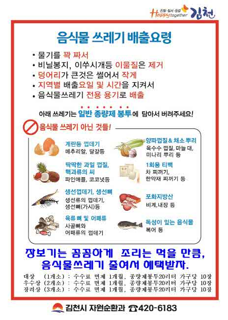 김천시 관계자는 “음식물쓰레기 발생을 줄이고 있는 시민들의 참여로 감량이 이뤄지고 있지만 시 전체로는 감량이 부족한 실정이라며 장보기부터 꼼꼼하게 체크하여 먹을 만큼 조리하고 음식물쓰레기는 물기를 최대한 제거한 후 배출해주시길 바란다고 하였으며, 이를 통한 예산감소는 시민들이 받을 수 있는 혜택으로 만들겠다.”고 전했다.