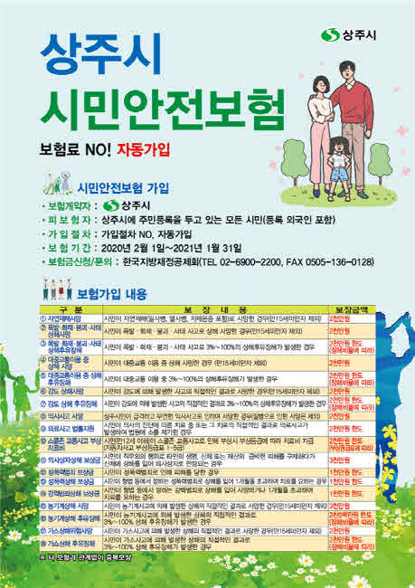 시민안전보험은 민선 7기 시정의 재난·안전 분야 주요 공약사업으로 시가 직접 보험사와 계약하고 비용을 부담한다. 각종 자연재해, 재난, 사고로 후유장해를 입거나 사망한 시민에게 보험사를 통해 최대 3,000만 원의 보험금을 지급하는 제도다. 상주 시민 누구나 신청 없이 자동 가입된다.