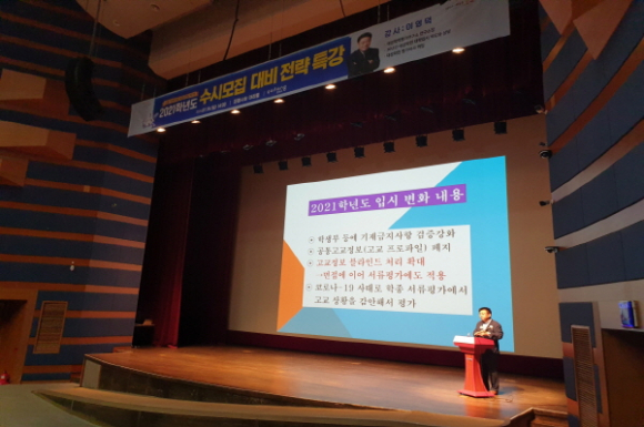 이날 특강은 코로나19로 인해 미뤄진 원서접수 시기와 대학 수시모집에 대해 불안감을 가지고 있는 수험생과 학부모들에게 다양한 입시정보를 제공하여 실질적이고 구체적인 도움을 주기 위해 마련됐다.