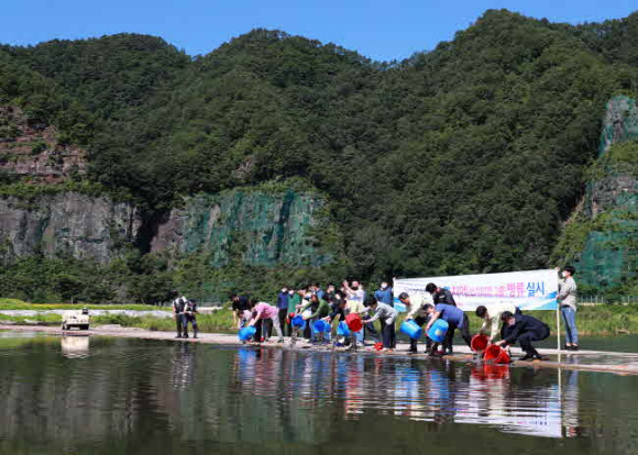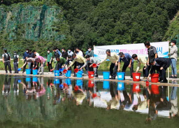 영양군(군수 오도창)은 7월 17일(금) 영양읍 감천리 및 관내 주요 하천에 쏘가리, 메기, 붕어, 미꾸리 등 치어 30만5천미와 다슬기(종패) 125만패를 방류하여 내수면 수산자원 및 토종생태계 보존에 힘쓰고 있다. 오도창 영양군수를 비롯하여 장영호 군의회 의장·군의원 및 지역주민 등 20여명이 참여한 가운데 사회적 거리두기 1단계 시행에 따른 예방수칙을 준수하여 국립수산과학원의 전염병 검사를 마친 우수한 치어 중 향토 어종인 쏘가리 외 4종 155만5천미를 관내 하천 및 저수지에 방류했다. 향토 어종 치어방류는 외래 어종 유입 및 어족 남획 등으로 줄어드는 향토 어종을 보호하고 증식하는데 의의가 있으며, 환경오염 등으로 점차 사라져가는 토속어종을 보호․육성하여 미래의 어족자원으로 조성하기 위하여 영양군은 앞으로 치어 방류사업을 지속적으로 실시할 계획이다.