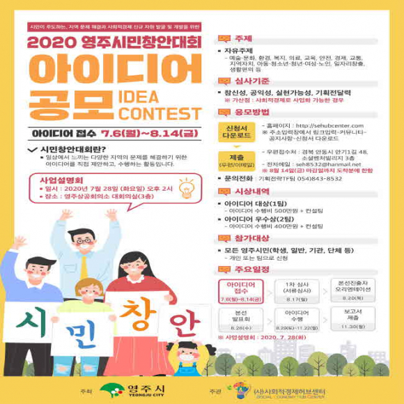 장욱현 영주시장은 “다양한 지역문제 해결과 사회적 경제 활성화를 위해서는 시민들의 관심이 무엇보다 중요하다.”며, “2020 영주시민창안대회 아이디어 공모에 많은 관심과 참여 부탁드린다.”고 말했다.