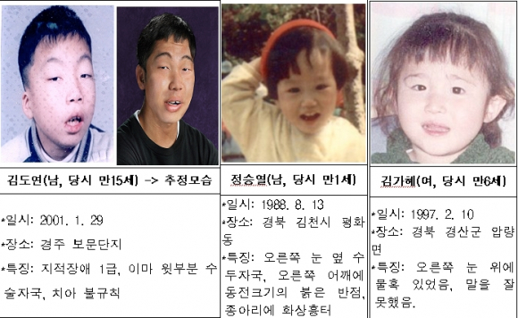 김도연(남, 당시 만15세) -> 추정모습(사진참고) *일시: 2001. 1. 29 *장소: 경주 보문단지 *특징: 지적장애 1급, 이마 윗부분 수술자국, 치아 불규칙