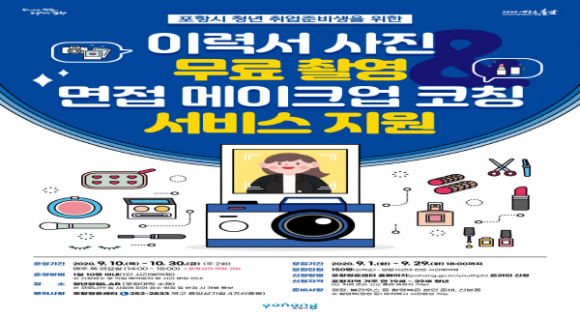 포항시는 취업을 준비 중인 청년을 대상으로 오는 9월 10일부터 10월 30일까지 매주 2회에 걸쳐 청년 창업LAB에서 이력서 사진 무료 촬영 및 면접 메이크업 코칭 프로그램을 운영한다.