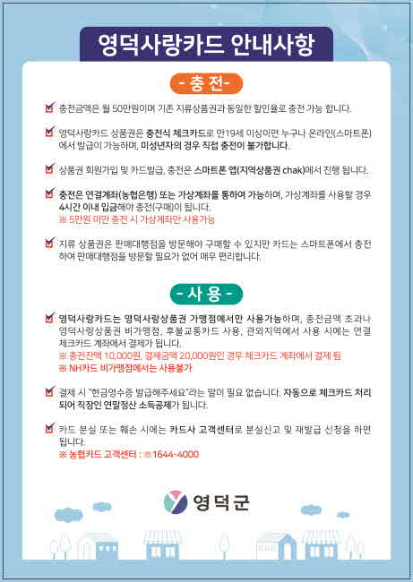 영덕군(군수 이희진)은 한국조폐공사, NH카드와 업무협약을 통해 카드형 영덕사랑상품권 ‘영덕사랑카드’를 12일부터 출시한다고 밝혔다. 영덕사랑카드는 충전식 체크카드(NH은행)형태로 만 19세 이상이면 누구나 스마트폰 앱 ‘지역상품권 chak’에서 발급 및 충전이 가능하다. 영덕사랑카드에 5,000원, 10,000원, 50,000원 단위로 상품권을 충전하면, 관내 영덕사랑상품권 가맹점 중 NH카드 가맹업소에서 상품권을 카드처럼 사용할 수 있다. 상품권 가맹점이 아닌 곳이나 영덕군 외의 지역에서 영덕사랑카드를 사용하는 경우에는 상품권이 아닌 연동된 체크카드 결제계좌에서 해당 금액이 출금된다. 영덕사랑카드는 기존 지류형 영덕사랑상품권처럼 상시 5%, 특별기간 10%의 할인금액이 적용되어 월 50만원, 연 500만원 까지 충전이 가능하며, 연말정산 시 체크카드와 동일한 소득공제 혜택이 있다.