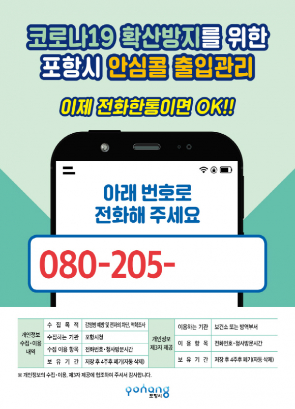 포항시는 주민들의 읍면동 청사 출입에 대한 편의 제공을 위해 10월 15일부터 시청, 읍면동을 기준으로 080(수신자 부담) ‘안심콜(Call) 출입관리서비스’를 실시하고 있다.